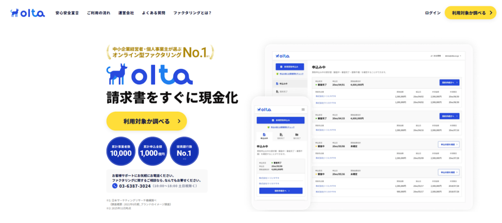 OLTA(オルタ)は、「クラウドファクタリング」と呼ばれる完全オンライン型ファクタリングサービスを国内でいち早く展開した企業です。